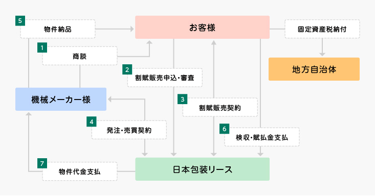割賦販売は、お客様が希望する物件を、日本包装リースがお客様に代わり購入し、お客様にその物件を長期・分割払いで販売する取引です。税務上リースに適さない物件や、所有を希望される物件に対し、割賦販売をご提供します。